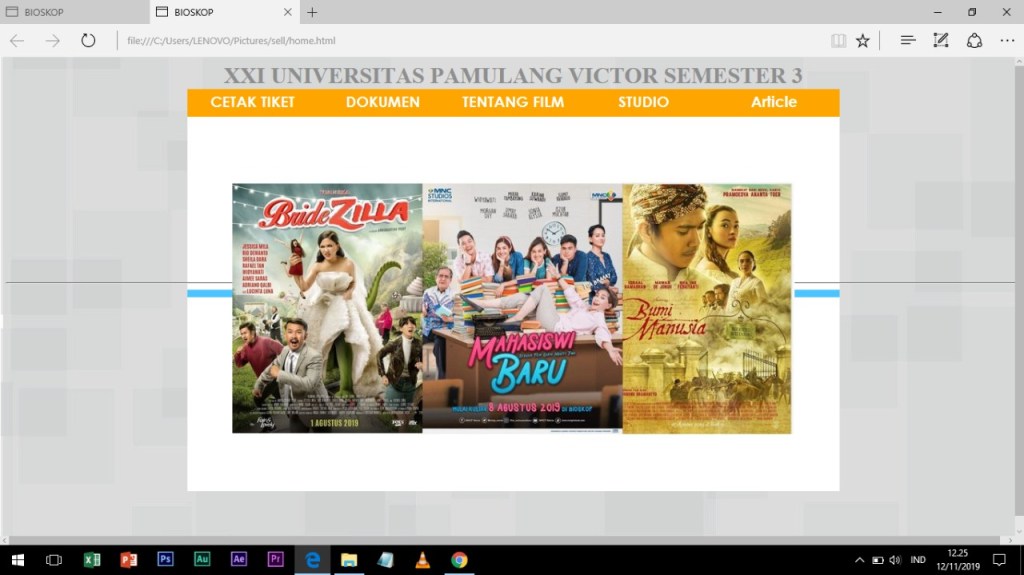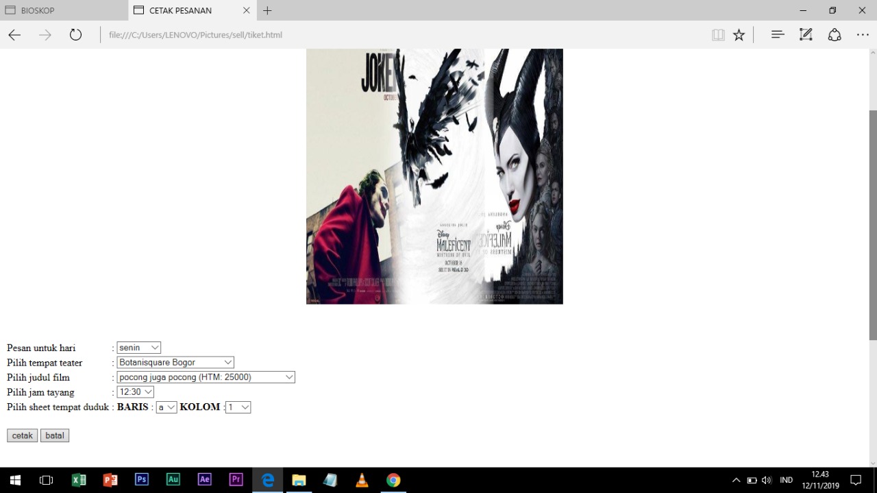 - Pada foto pertama merupakan tampilan ketika bagian “Cetak Tiket” di dalam tampilan awal di klik. Ini berfungsi untuk menentukan hari, waktu tayangan, dan tempat duduk yang ada.